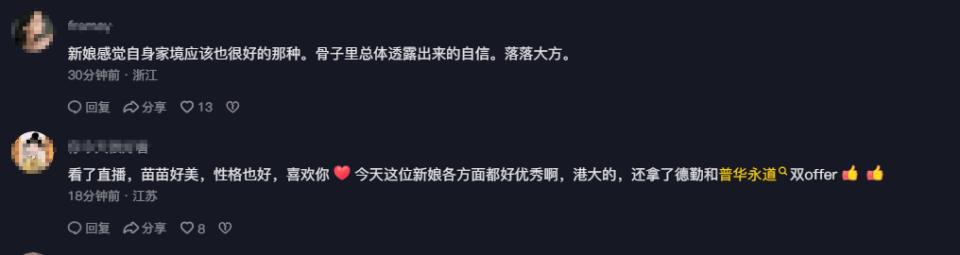 新娘温柔大气,在敬茶环节表现的落落大方,看起来十分乖巧。苗苗在直播中提到,表弟媳是香港大学的高材生,虽然比不上意尔康家大业大,但是学历绝对拿得出手,想必父母也从小用心培养。