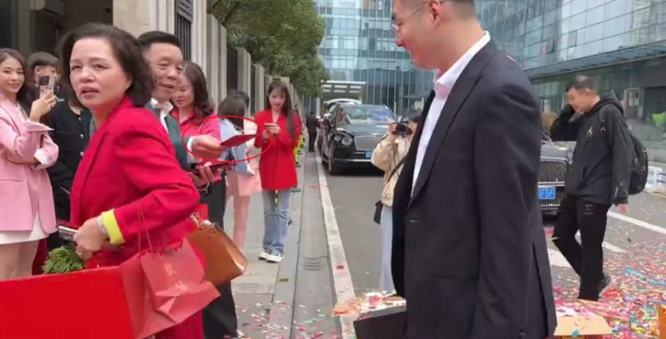 在订婚礼刚开始的环节,新郎的父亲,也就是苗苗的大伯在楼下迎接送亲队伍,他手中拿着厚厚的红包,给所有来送东西的亲戚人手一个。