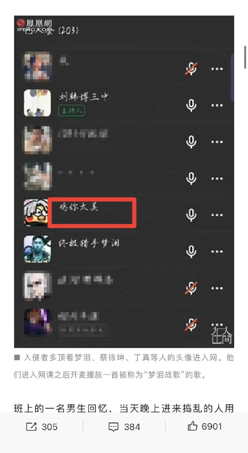 本来玩梗无可厚非,但是一些人借着玩梗来批皮做人身攻击的事。比如一些人趁着学生上网课的时机就化身“鸡你太美”进教师网课的直播间,对教师进行辱骂,故意刺激教师。