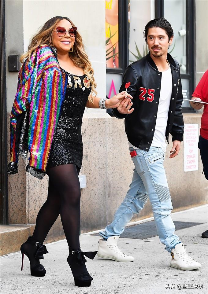 玛丽亚·凯莉(MariahCarey)与男友布莱恩·田中(BryanTanaka)在纽约观看《兄弟》(Bros)时,穿着这件紧身亮片迷你裙,上衣搭配彩虹亮片夹克。
