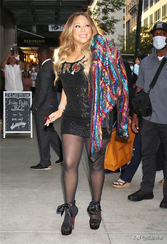 玛丽亚·凯莉(MariahCarey)在纽约穿着这件紧身的黑色亮片迷你裙,上面用金色亮片写着“兄弟们”。她搭配了纯黑色紧身裤、黑色Louboutin和彩虹条纹亮片夹克。