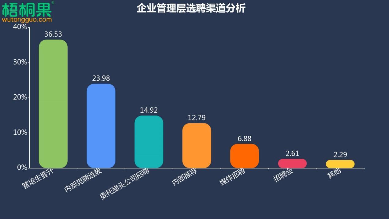 通过对梧桐果平台3万家会员企业调查发现,企业管理层选聘渠道有管培生晋升、内部竞聘选拔、委托猎头公司招聘、内部推荐、媒体招聘和招聘会等,其中管培生晋升成为企业选拔管理层的主要渠道,其占比为36.53%;内部竞聘选拔以23.98%的占比排在第二位;委托猎头公司招聘排名第三,占比14.92%。