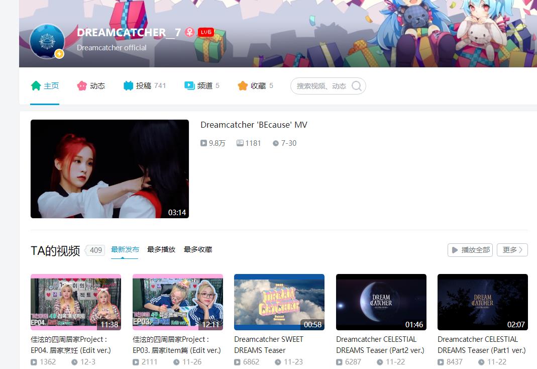 另外,B站并没有限制韩国艺人发动态,所以很多知名艺人在上面更新,Dreamcatcher也有其B站账号,更新比较频繁,还带中文字幕,不定期还有学中文的vlog,算是B站韩国艺人账号里比较用心的了。
