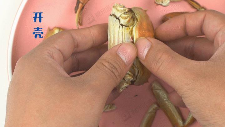 (2)开壳:把螃蟹的背壳(头胸甲)和腹部(蟹脐)的小盖子掰下来。