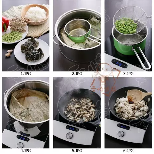 1)干荷叶冲净浮土,放入清水中压上一个重物浸泡软,然后放入开水中煮3分钟,取出后冲净沥干。剪成圆形,铺在笼屉底部。(如果是新鲜的荷叶,直接煮就可以了,不用浸泡)