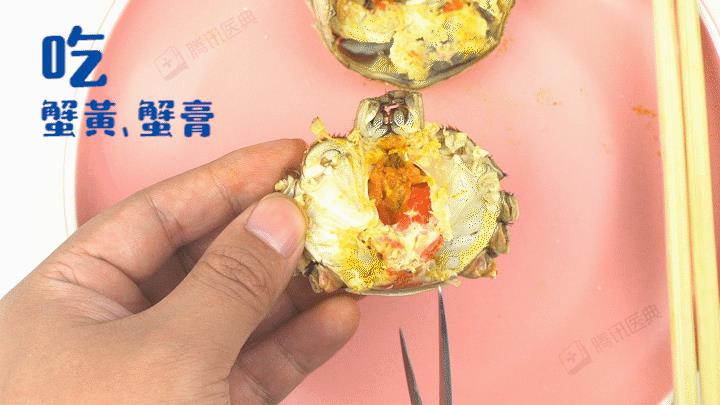 (4)吃蟹黄、蟹膏:双手握着螃蟹两边,从中间掰开,用手和嘴把蟹身上及蟹背壳上的蟹黄、蟹膏挑出来吃掉。