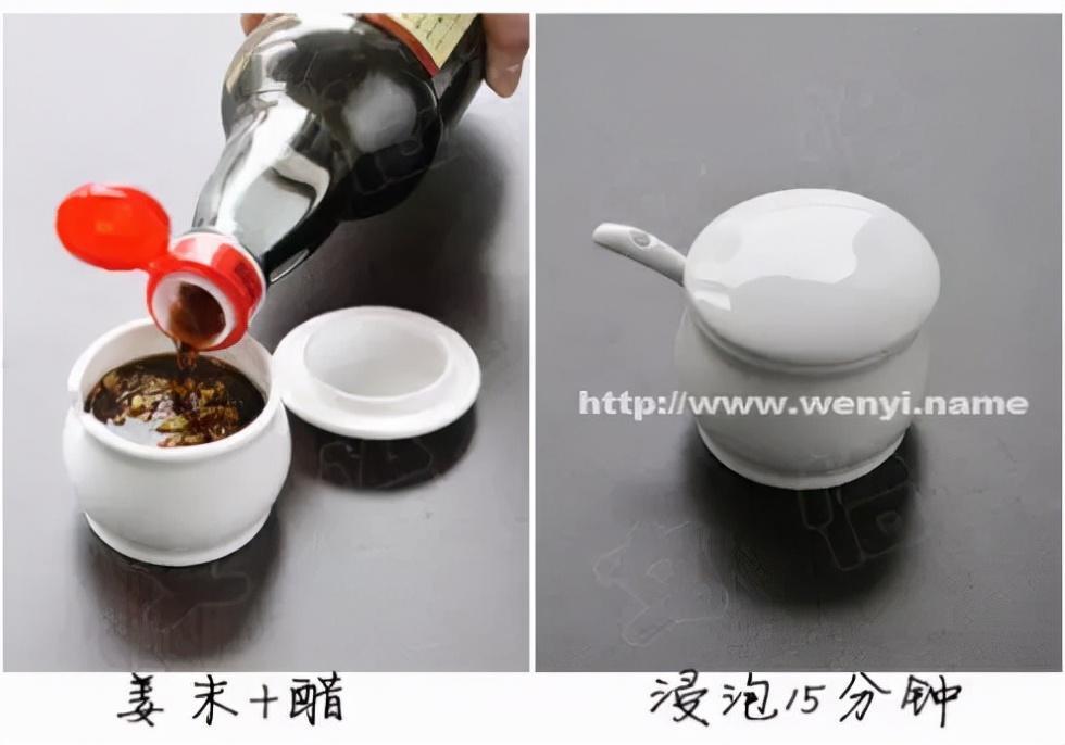 4)在处理螃蟹前,先把姜去皮切成细末,放入容器中,然后倒入醋,浸泡15分钟后,再用来蘸食螃蟹,味道更好。
