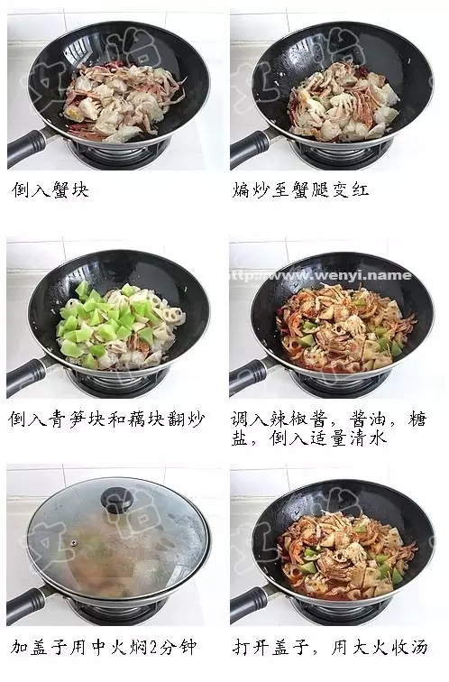 3)倒入蟹块,煸炒至蟹腿变红,倒入青笋块和藕块翻炒。