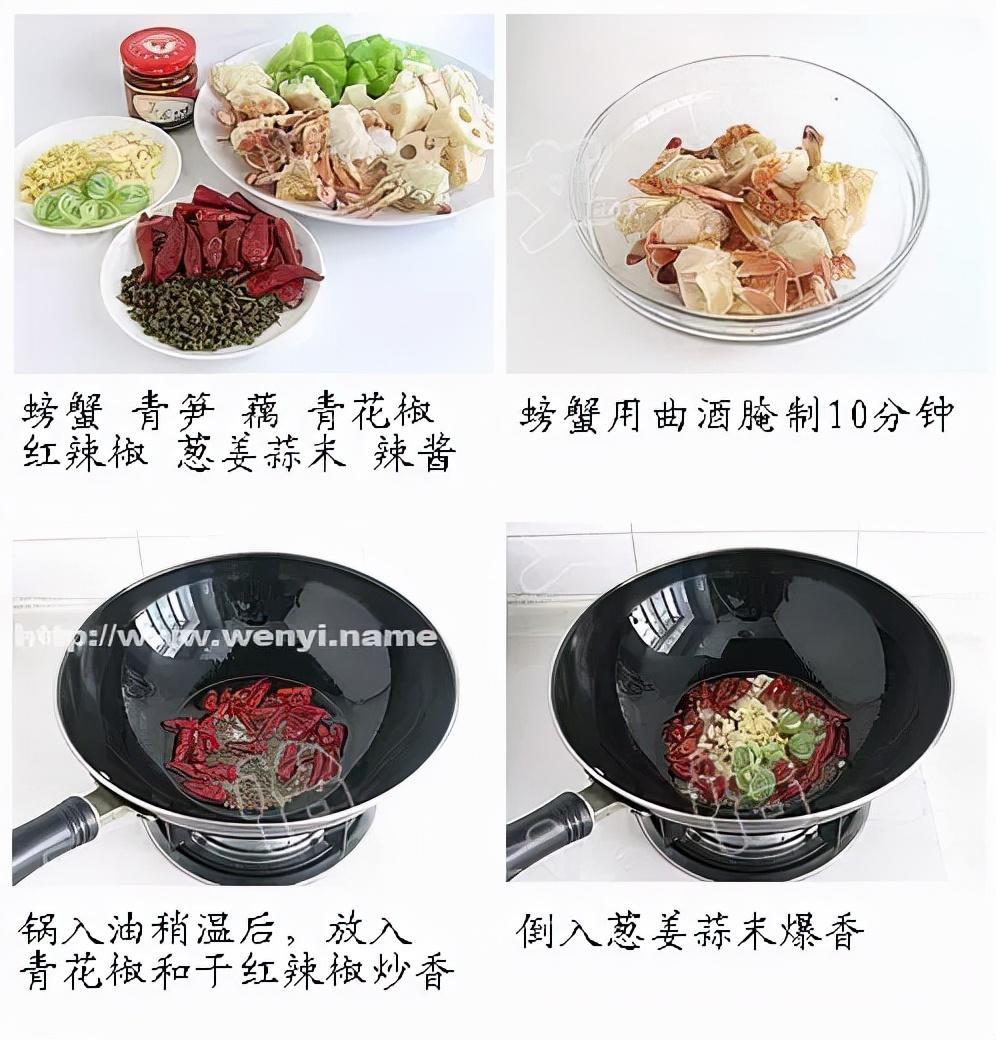 1)将小螃蟹冲净后切开,用曲酒腌制10分钟。青笋去皮洗净切块。藕去皮洗净切块。
