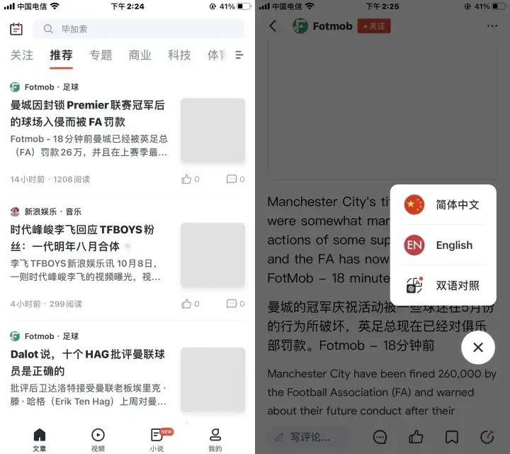 这是一个双语咨询平台,上面所有新闻咨询都可以看到中文、英文或者中英文对照,拥有全球300个优质的杂志、媒体,可以轻松快速get热点新闻,不仅可以Get热点新闻,还有利于英文的学习,不仅支持中英文对照,还支持生词翻译、语音朗读