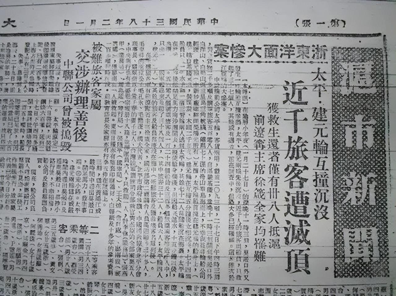 造化弄人,王淑贞最担心的事情还是发生了。2月1日,她在报纸的头版上看到了一则消息:原本从上海出发的太平轮,在海上和迎面驶来的建元轮撞在了一起。建元轮当场沉入海底,太平轮的体积较大,原本想要快速返回海岸,可因为当天晚上的风浪太大,还没能撑到海岸边,太平轮也沉没了。