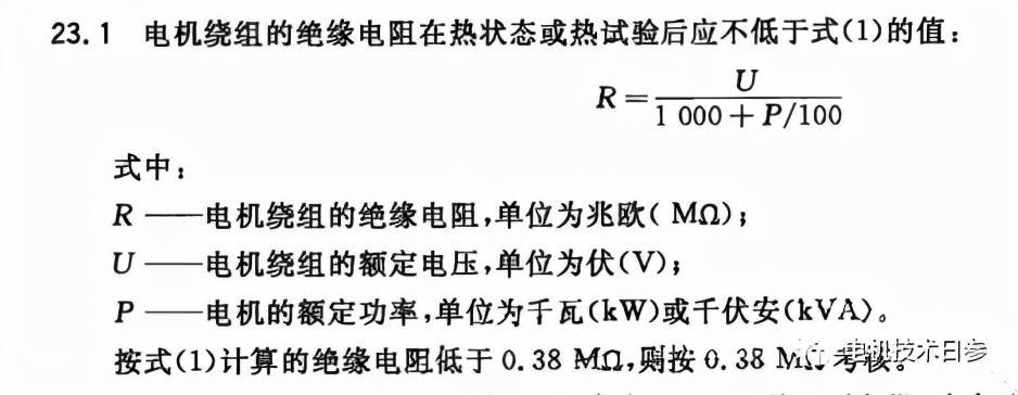 GB/T 14711是针对于中小型旋转电机的通用性安全要求标准,标准电机在热态或热试验后的绝缘电阻最小值,与电机的额定电压和功率有直接关系,具体按下图的公式计算,并将0.38兆欧规定为最低限定值。
