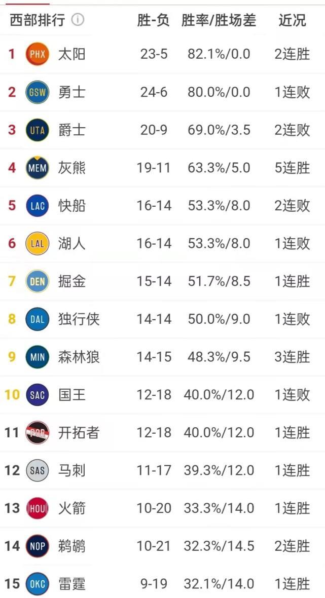 西部排行榜:太阳23胜5负、勇士24胜6负、爵士20胜9负、灰熊19胜11负、快船16胜14负、湖人16胜14负、掘金15胜14负、独行侠14胜14负,后面依次为森林狼、国王、开拓者、马刺、火箭、鹈鹕、雷霆。