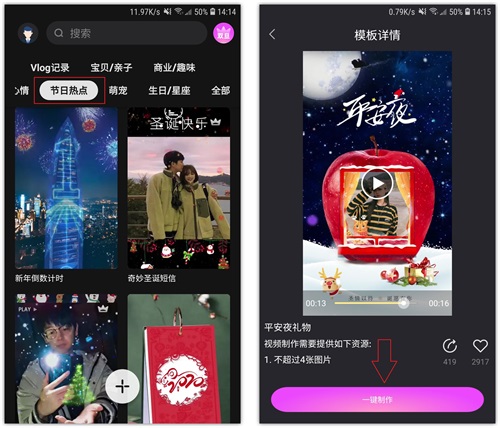 1.我们还可以用一键视频,将照片制作成圣诞特效视频,打开这个工具,从【节日热点】分类中,选择一个视频模板,点击【一键制作】。