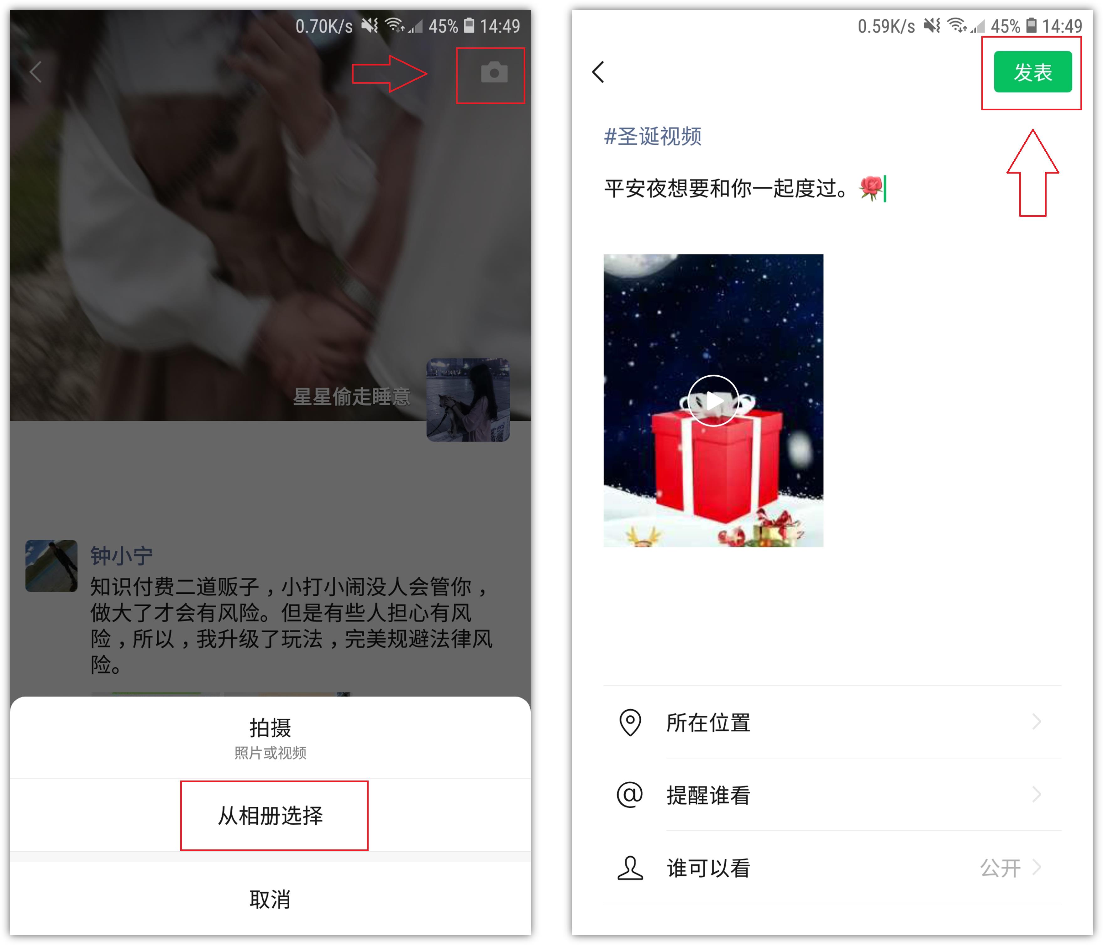 3.视频保存到相册后,打开微信朋友圈,点击右上角的相机按钮,从相册中选择圣诞特效视频,点击【发表】,朋友看到了都会为你点赞。