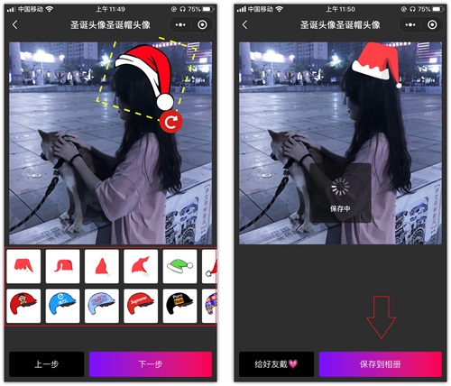 3.接下来将会看到,这里有很多款圣诞帽,选择一个自己喜欢的样式,帽子可以旋转、缩放,最后点击【下一步】,选择【保存到相册】。