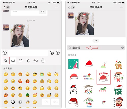 1.不用工具也能制作圣诞帽头像,在好友聊天表情界面,点击左上角的放大镜图标,搜索“圣诞帽”,选择几个满意的圣诞帽发送出去。