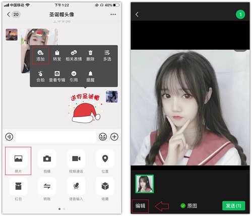 2.接下来长按圣诞帽表情,在呼出的菜单栏中点击【添加】,然后再点击【照片】,选择一张做头像的图片,先别发送,点击【编辑】。