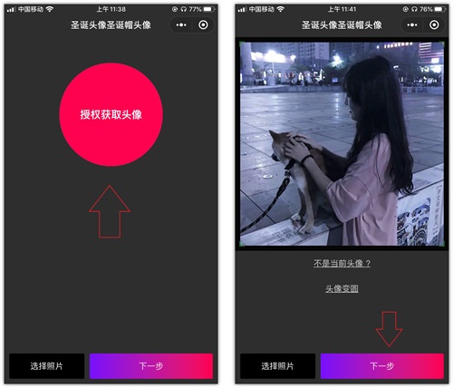 2.打开后点击【授权获取头像】,你的微信头像就添加到这上面了,然后点击【下一步】。你也可以将相册中的照片制作成圣诞帽头像。
