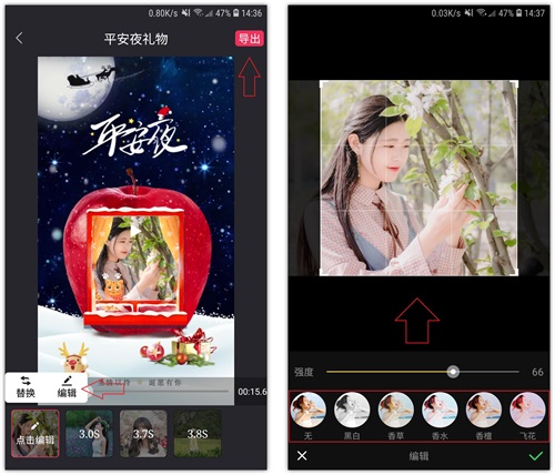 2.然后从手机相册中添加照片,这样照片就自动生成视频了,并且每张照片都可以编辑,裁剪、添加滤镜效果,最后点击【导出】即可。