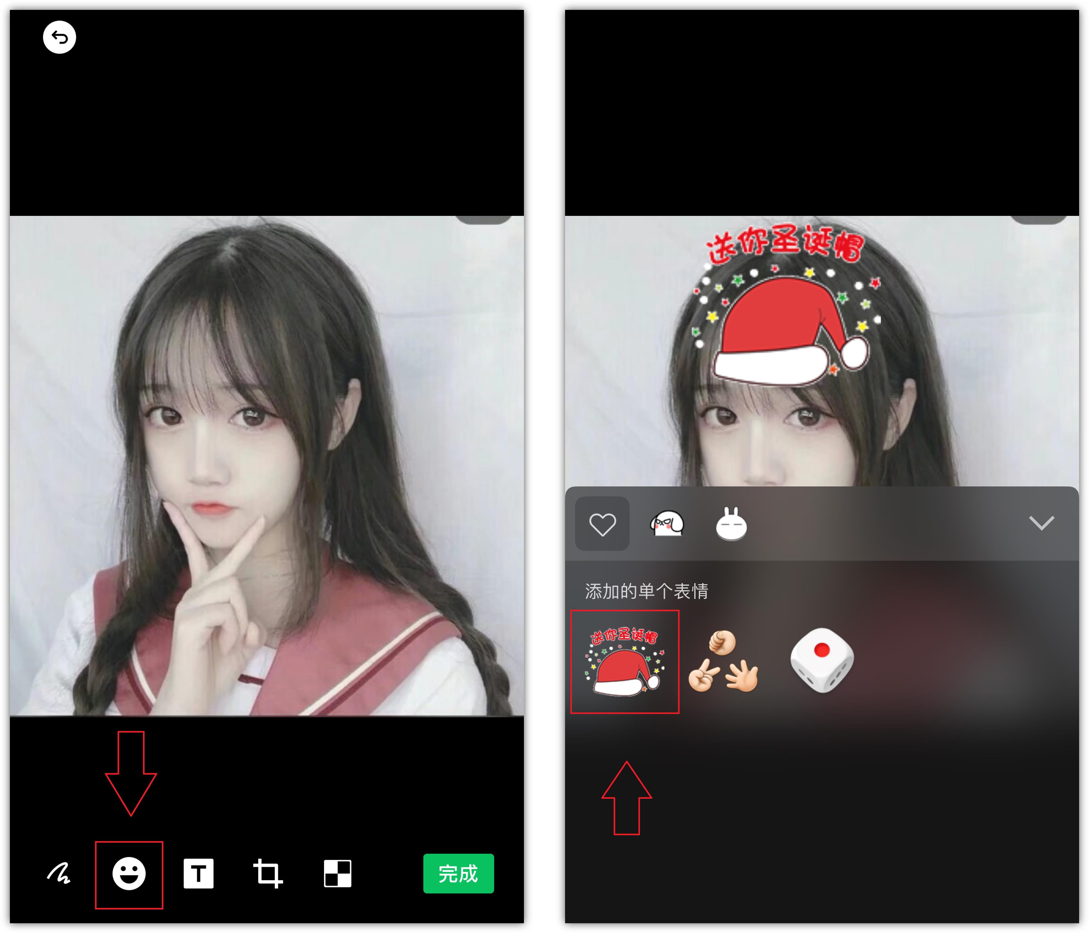 3.屏幕底部有5个功能,点击笑脸图标,将会打开我们收藏的表情库,从里面找到刚才添加的圣诞帽,移动到头像上,支持旋转和缩放。