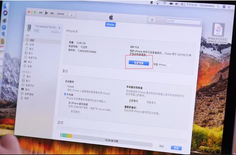 2、将电脑与手机连接以后,有一个“检查更新”,在这之前你要确认你的固件已经下载好了;