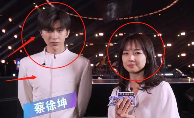 在采访中,身穿白色西装的蔡徐坤刚表演完走下舞台,外形精致的他表情略显严肃。在他身旁的王冰冰留着齐刘海披肩发,身穿白色雪纺衫,笑容甜美面对镜头。