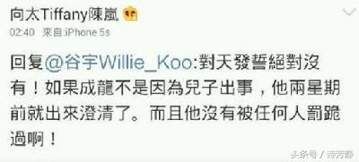 以上是向太对“向华强逼成龙下跪”一事的解释,向太的回复很直接,这个锅他们不背。你信也好,不信也罢,我只是告诉大家有很多事不是别人说什么就是什么,如果你还觉得“向华强逼成龙下跪”一事是真的,请拿出足够的证据,否则的话,请保持一颗怀疑的心。