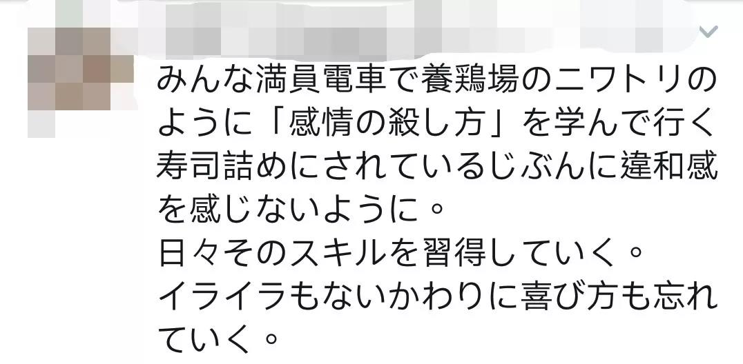 大家为了在挤死人的电车上不感到痛苦,都像养鸡场里面的鸡一样练习着“丧失感情的方法”。