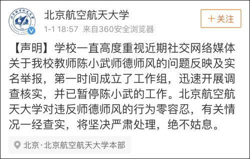 当晚,北京航空航天大学通过官方微博发布声明称,关于教师陈小武师德师风的问题反映及实名举报,学校第一时间成立了工作组,迅速开展调查核实,并已暂停陈小武的工作。