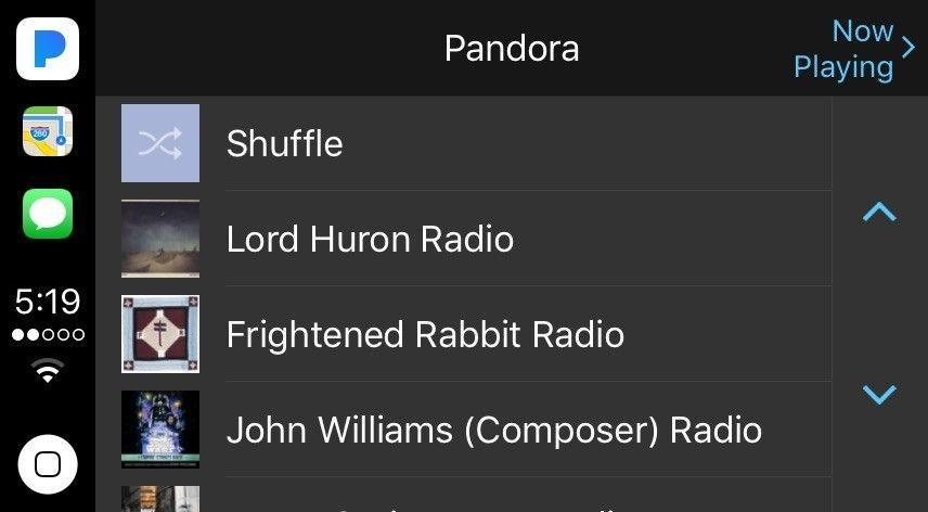 在这些应用程序中,Pandora 可能是最能够表达 CarPlay 应用的内涵的。打开 Pandora,点击一个广播电台,然后你就完成操作了。 Pandora 会开始播放,你不需要在任何菜单之间切换,这种简单的权衡,显然是缺乏选择的体现,但如果你在使用 Pandora 的话,你可能已经知道,这是服务交易的一部分。你不会在乎这些,因为你已经听到了一系列非常酷的音乐。