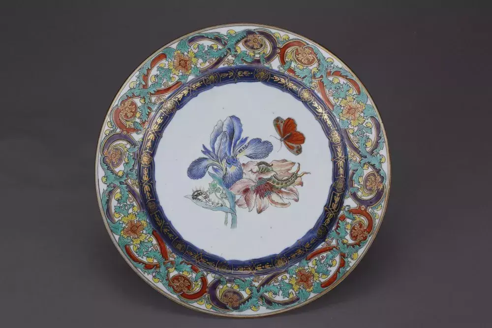 这是画于十八世纪早期雍正年间的一块外销盘子,是欧洲贵族们的餐具。