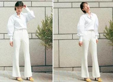 喇叭裤与衬衫搭配,这种穿法不时髦,也不落伍,可随时穿,而且休闲随意,穿着更舒适。