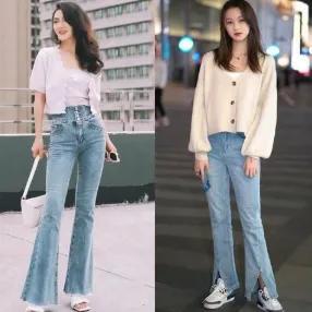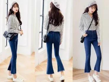 喇叭裤百搭又显瘦,高腰裤设计,显身材,九分的裁剪加喇叭裤,轻盈的穿着能起到显瘦的效果,裤口做了流苏设计,让裤子看起来时尚更好看,配条纹衬衫,竖条纹的设计,有拉长身体比例的既视感,外加高腰裤,超好看,还显瘦。