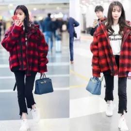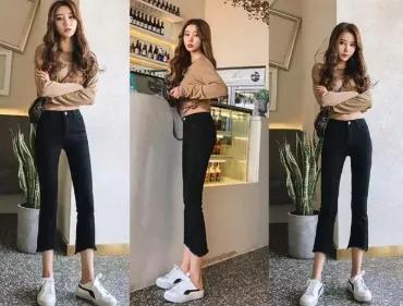 喇叭裤配上紧身上衣,十分显瘦,外加紧身上衣束在裤子里,增加了腰线,让人看起来更瘦更高。