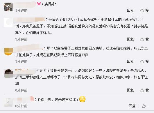 虽然郑爽吧在撤换的公告当中对于前任吧主为什么被撤没有说明,但根据郑爽粉丝爆料,被换下来的吧主是因为私吞了应援的四万块钱,粉丝在贴吧控诉被郑爽知道才有了接下来亲自打电话给百度工作人员的事情。