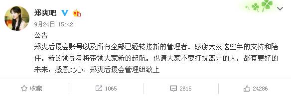 给出的爆料线索z姓,当红花旦,以及身材,结合下来小编第一个想到的就是郑爽,而郑爽吧在10月15日当天发出公告“关于撤销 郑爽吧吧务管理 吧主管理权限的说明”以及之前郑爽吧在微博发出的“郑爽后援会账号以及所有全部已经转接新的管理者”更是给这个消息定下实锤↓