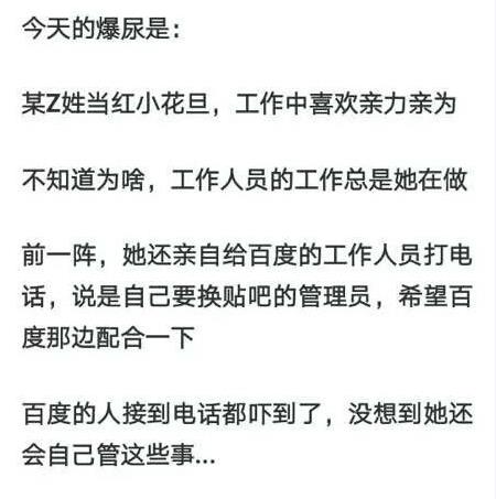 近日有媒体爆料称z姓当红小花旦亲自给百度员工打电话,要求撤换自己贴吧管理员。工作人员在接到电话那一刻都懵了,没相当艺人这么忙还有工夫管这种小事……