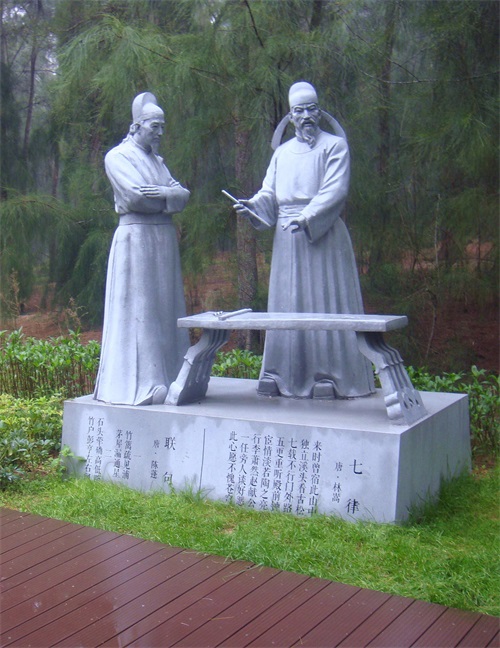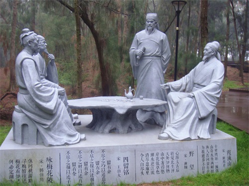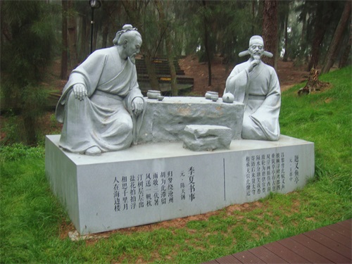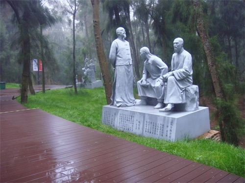 沿着平平坦坦的木栈道,穿过郁郁葱葱的松树林, 道路左侧有一系列当地名人雕塑,有的坐着、有的站着、有的捧书、有的执笔,或吟诗、或填词,讴歌秀丽风光,大好河山。