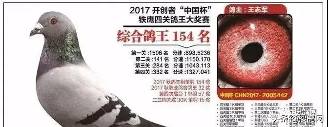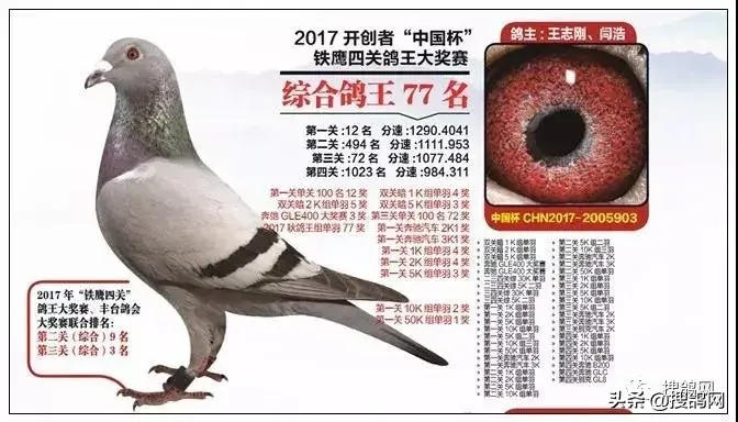 第十羽,17年北京开创者铁鹰四关综合鸽王77名,身价100万。