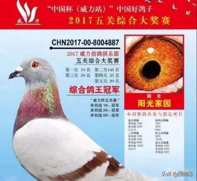 第七羽,17年西安威力赛鸽俱乐部五关综合大奖赛五关综合冠军,身价120万。