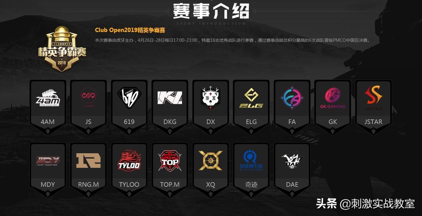在这场《刺激战场》PMCO虎牙预选赛中,一共有16支职业俱乐部参加比赛。其中,有我们比较熟悉的TopM、4AM、DKG、RNG.M、TYloo、DAE等16支战队。