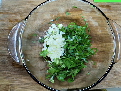 4、葱花切碎、大蒜切碎、香菜切碎,备用。