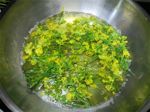 7、锅内烧油,油热后,把热油浇到油菜花和料汁上,即成。