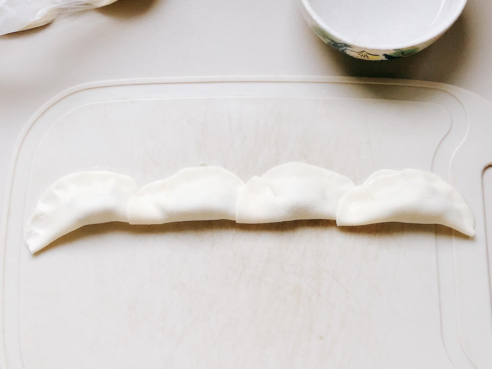 03.手指蘸水将饺子皮上边缘弄湿,然后从右侧开始依次对折。