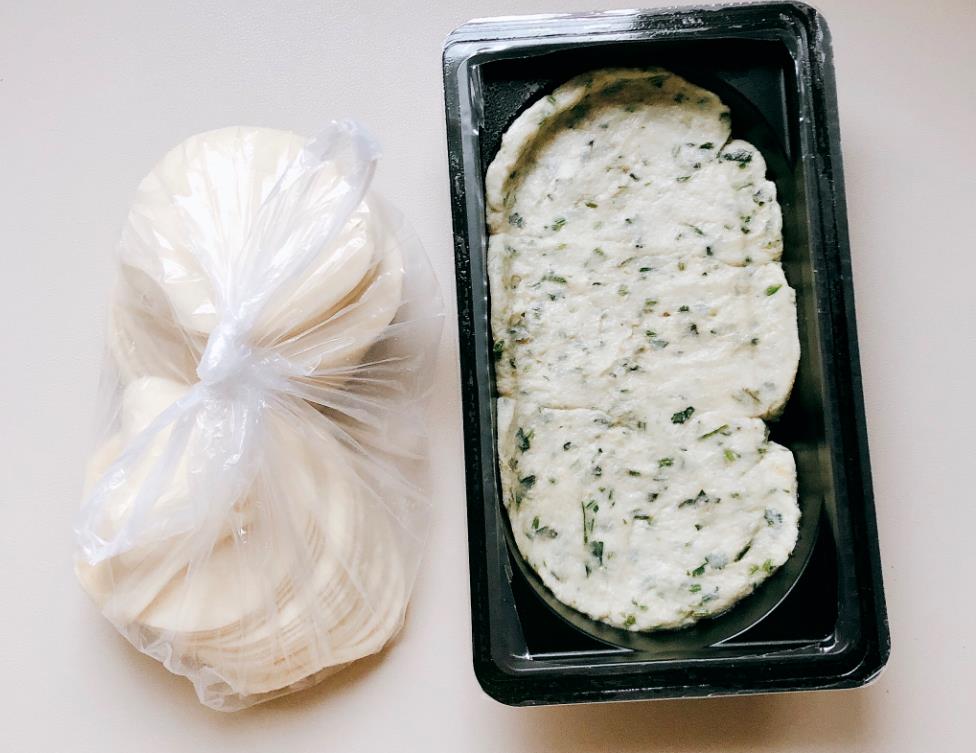 01.砧板上放一片饺子皮,手指蘸水涂湿边缘,然后用另一片饺子皮叠上,一共4片。