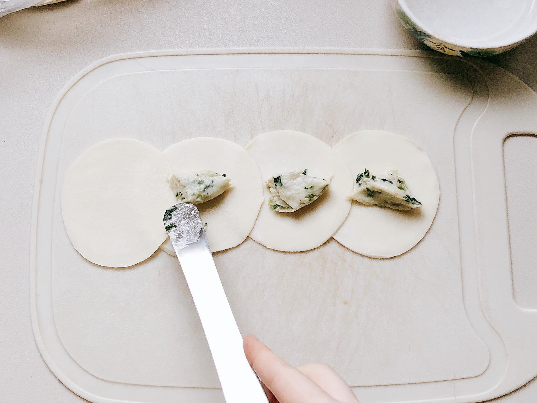 02.馅尺挖取大约1小勺的馅料放在每片饺子皮的中心。