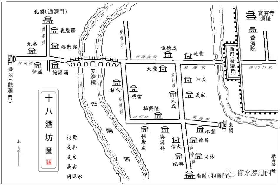 据桃城区河东老人们回忆,“十八酒坊”是个吉祥的名称,衡水老县城西关的酒坊最多时达三四十家,最少时十六家,不管数目多少,统一称作“十八酒坊”。每家酒坊的东家常常雇佣经理(掌柜的)来管理生意,每换一次经理就会另起一次酒坊门面的字号,所以酒坊的字号经常更换。唯独“德源涌”的字号四百年不变,更换经理,甚至更换了东家也不改字号。上图是民国十八年(1929年)前后时期“十八酒坊”分布情况,当时共计20家。至衡水县城解放后的1946年,冀南第五专署会同衡水县政府,采用购买的办法将当时衡水仅有的20家私人酒坊收归国有,成立了地方国营衡水制酒厂,私人酒坊的名字有所更换,总数20家,其中16家正在营业,4家暂时歇业,有合影照片为证。