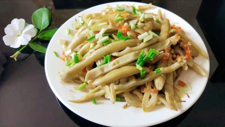 做法:将龙爪豆提前一天处理侵泡,取龙爪豆切条,锅中加猪油,油稍微加多一点,放入蒜末、辣椒爆香,加龙爪豆爆炒,炒熟后加适量盐翻炒入味,出锅后撒上葱花即可。