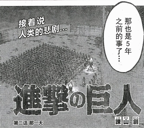 但在漫画中,作者的思路是和动画改编后有很大出入的。在第二话开头交代了,这是新兵结业演讲中的内容,所以叙述者是在回忆五年前的事件。漫画在五年前的回忆结束以后,是直接讲新兵结业以后的故事的。
